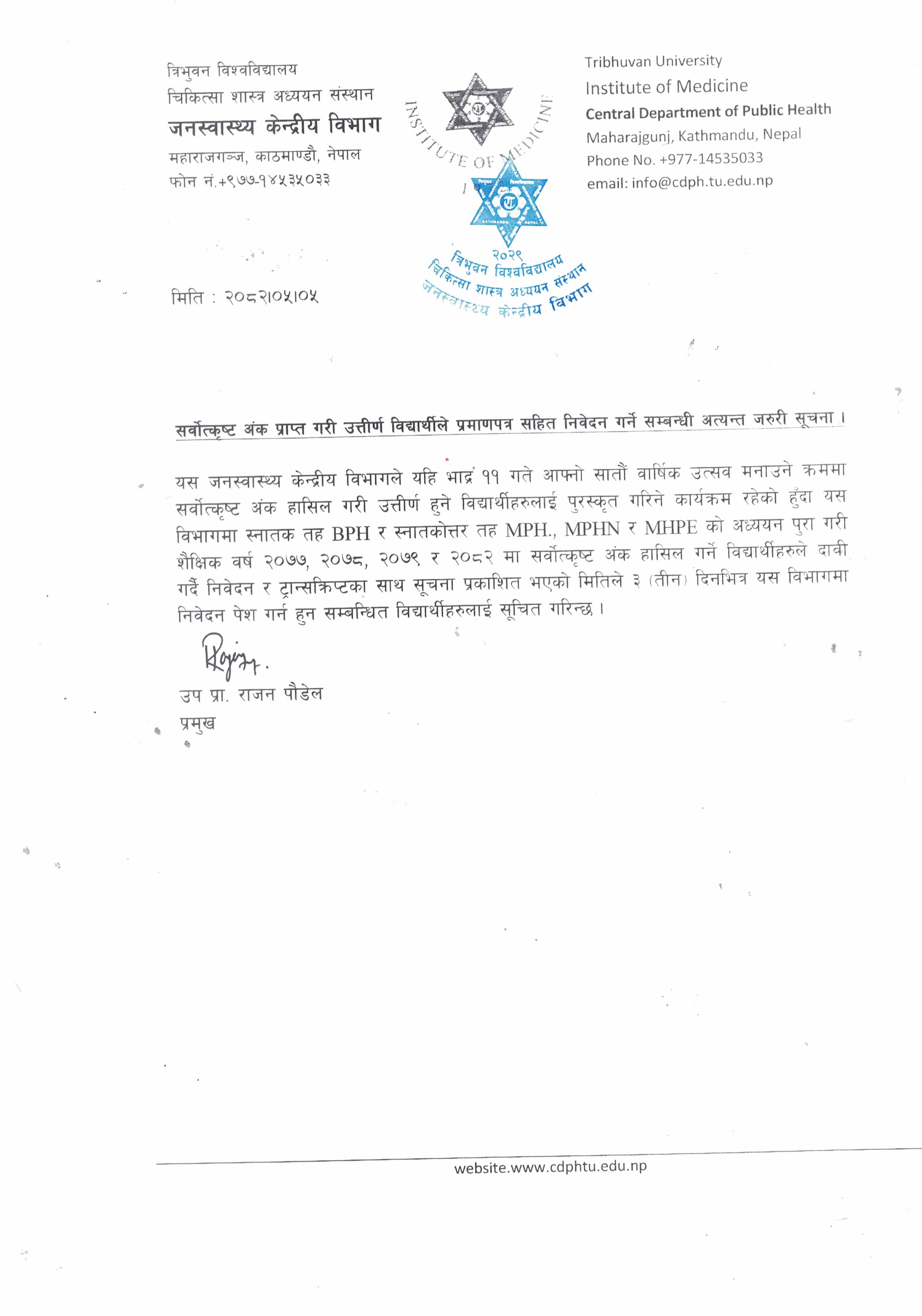 Urgent Notice: Application with Certificate for Students Securing Highest Marks